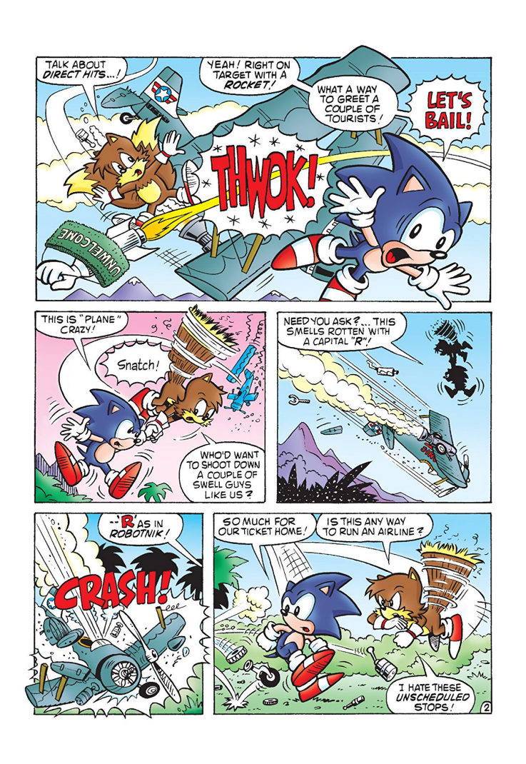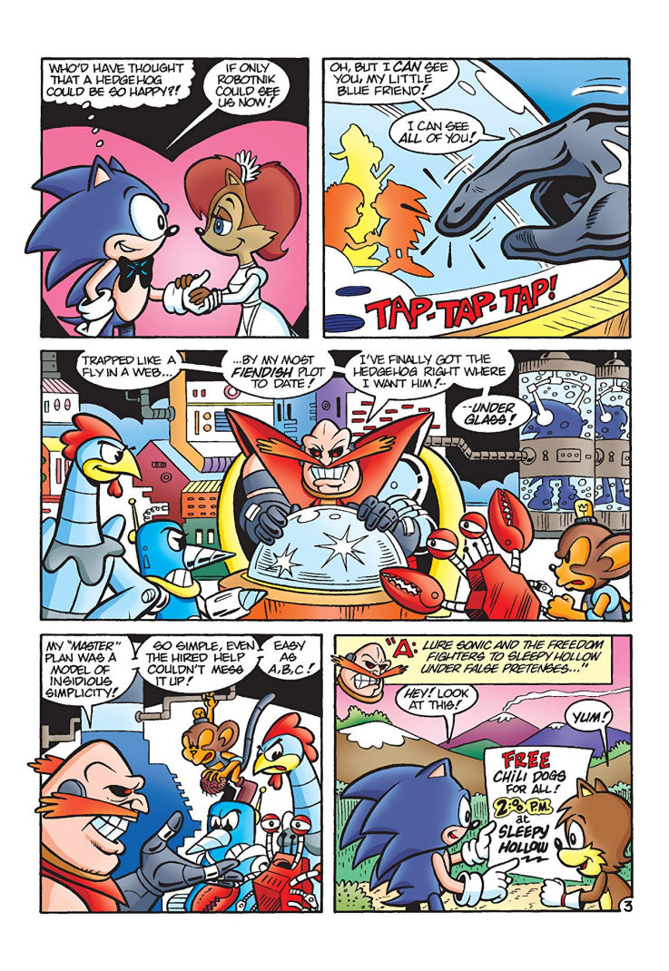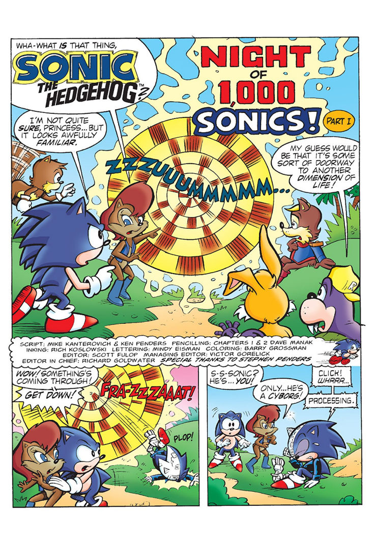 An alternate version of Robotnik, named Robo-Robotnik (after having roboticized himself in an attempt to conquer his dimension), comes to our Mobius via the Cosmic Interstate. He recruits Evil Sonic to steal the Giant's Hand, the key to opening the enormous creature Giant Borg, from the Neutral Zone. A mass recruitment of Sonics and bots begin, as Sonic and the real Dr. Robotnik join forces in hopes of stopping the crazed machine!