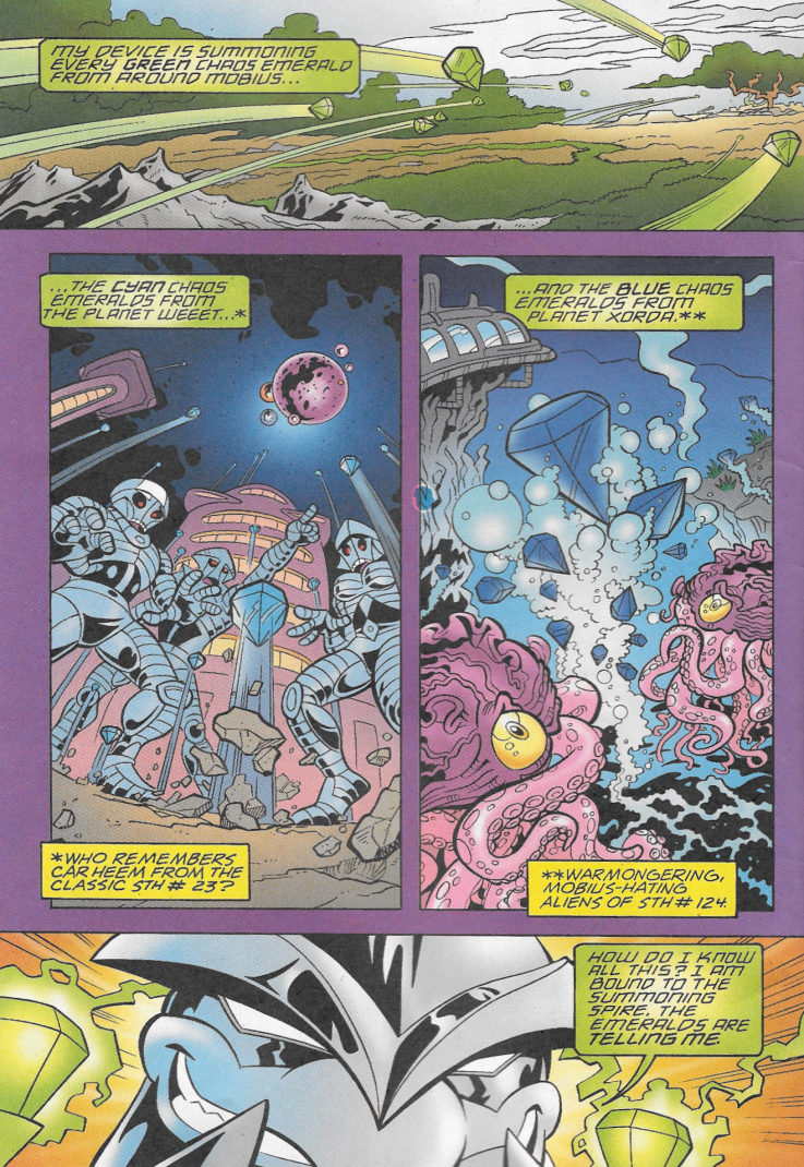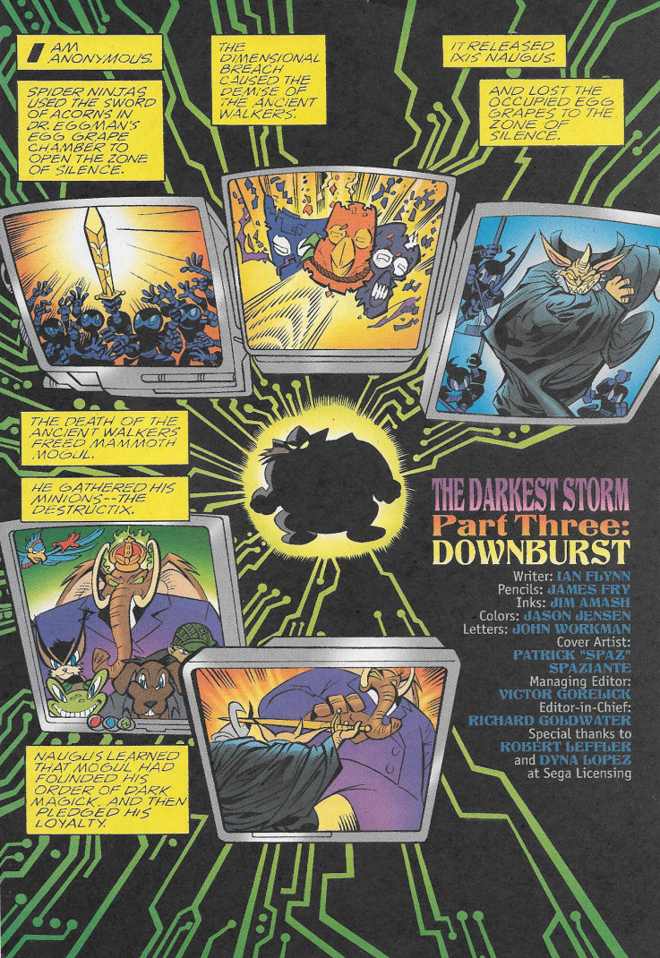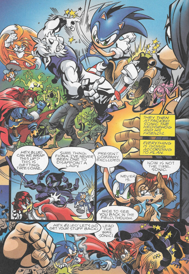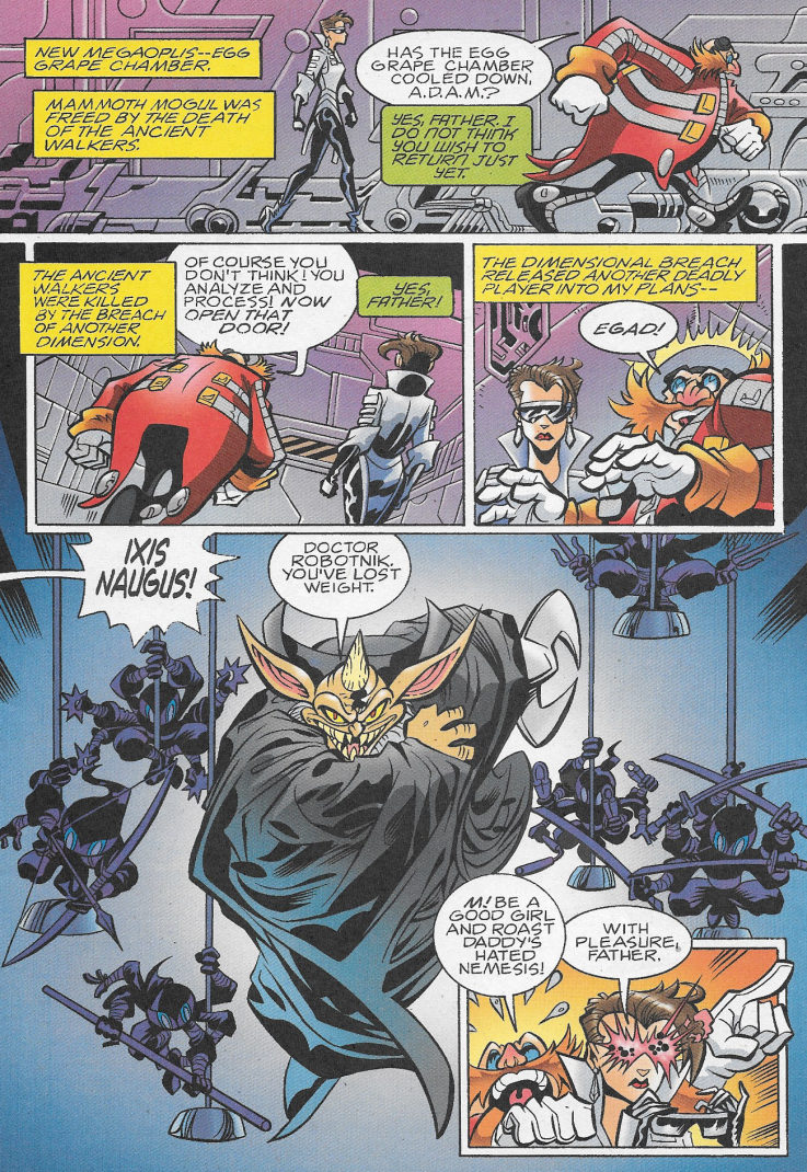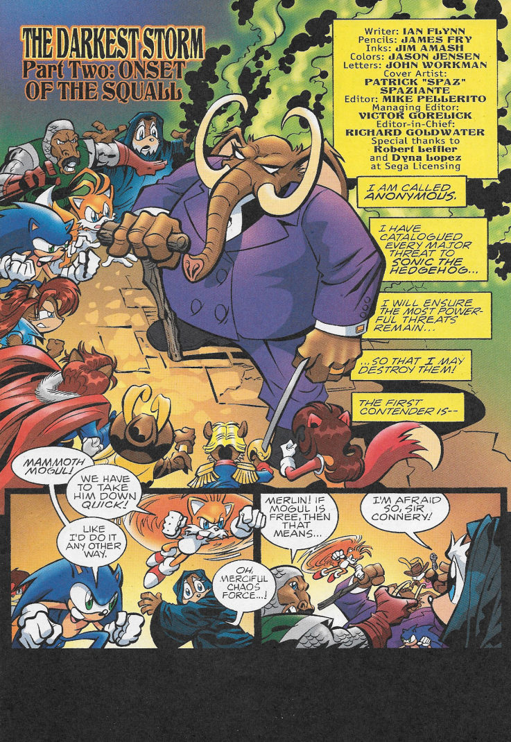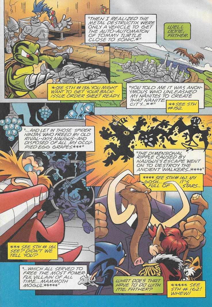 The action-packed, multi-issue epic warps into overdrive! Sonic not only squares off against some of his deadliest foes, the magical Ixis Naugus and the immortal Mammoth Mogul, but must also deal with an army of spider ninjas and the newest threat, The Destructix! Can even the combined strength of Sonic, the Freedom Fighters, Knuckles and the Chaotix be enough to save the day? And can another showdown with the ultimate evil, Dr. Robotnik be far away?
