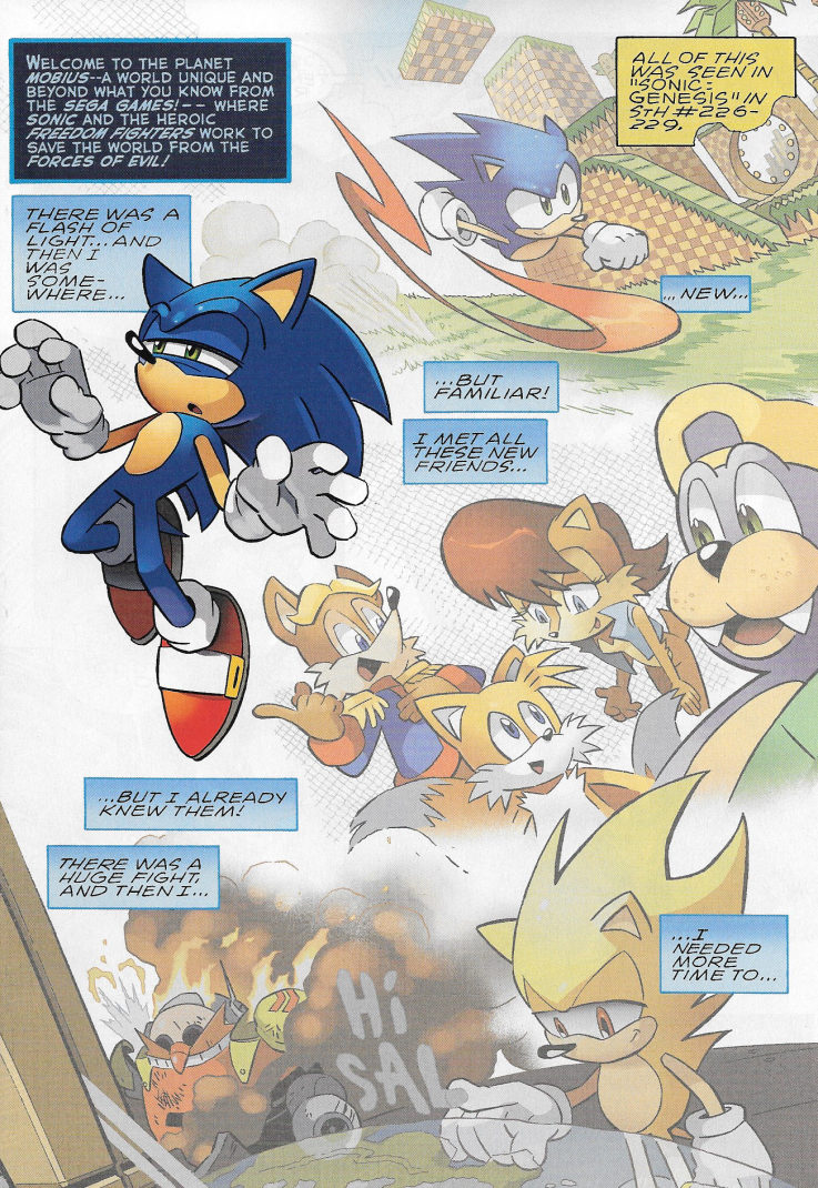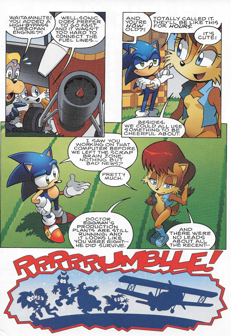 The most talked-about story in Sonic comic history continues as Sonic brings a curious new face into his adventures: Miles Prower, the boy genius! As Sonic and his friends continue the good fight against the evil Dr. Robotnik, the perils get more perilous, old memories begin to resurface, and the Death Egg orbits. Don't miss the penultimate issue to this anniversary special event!
