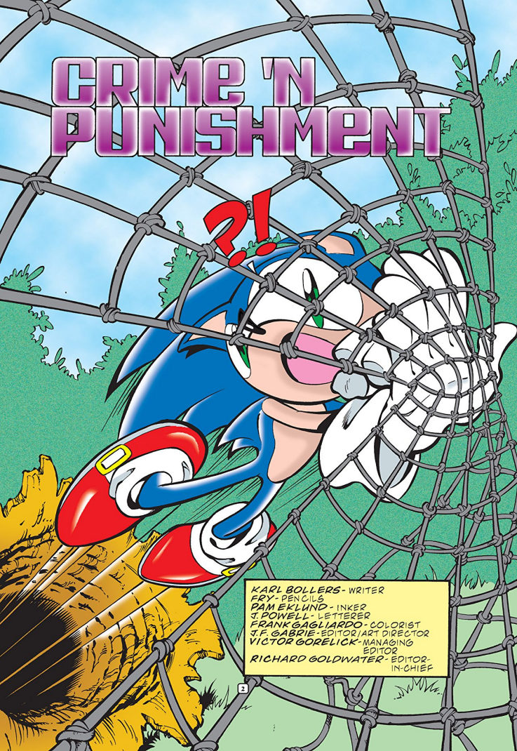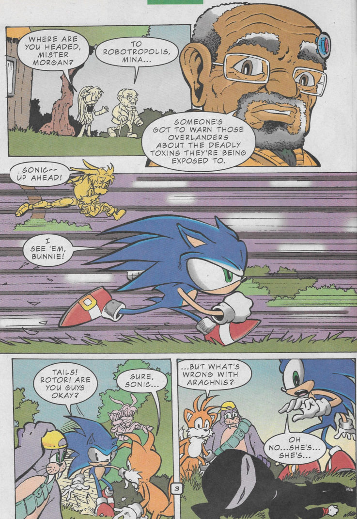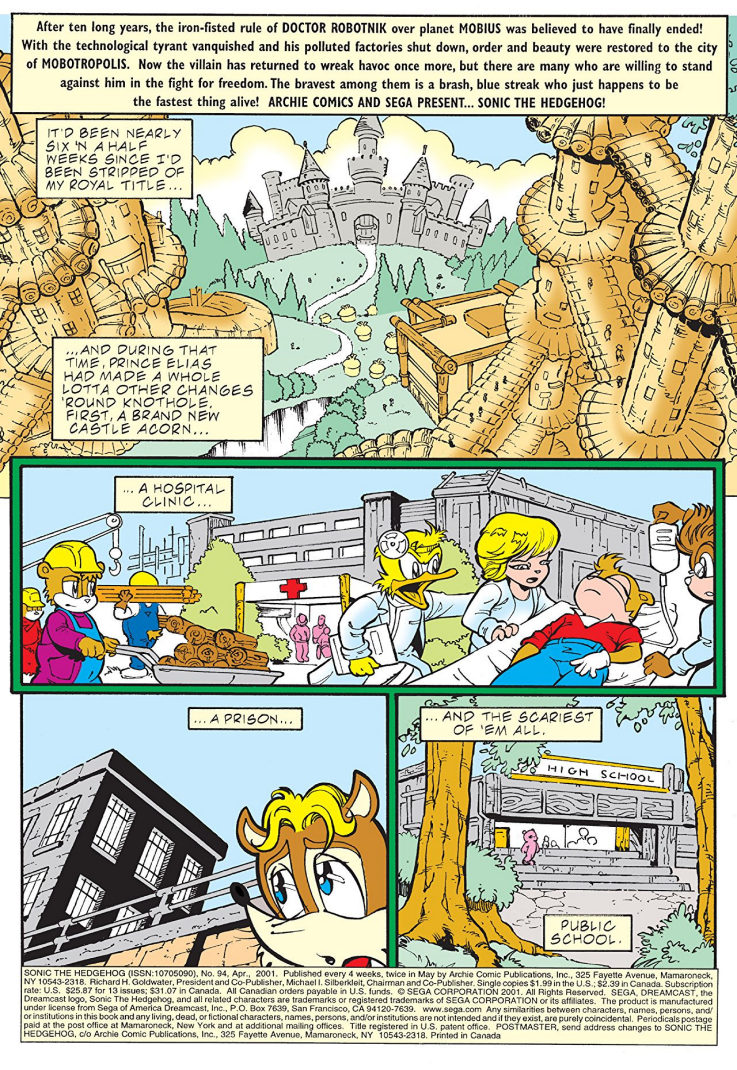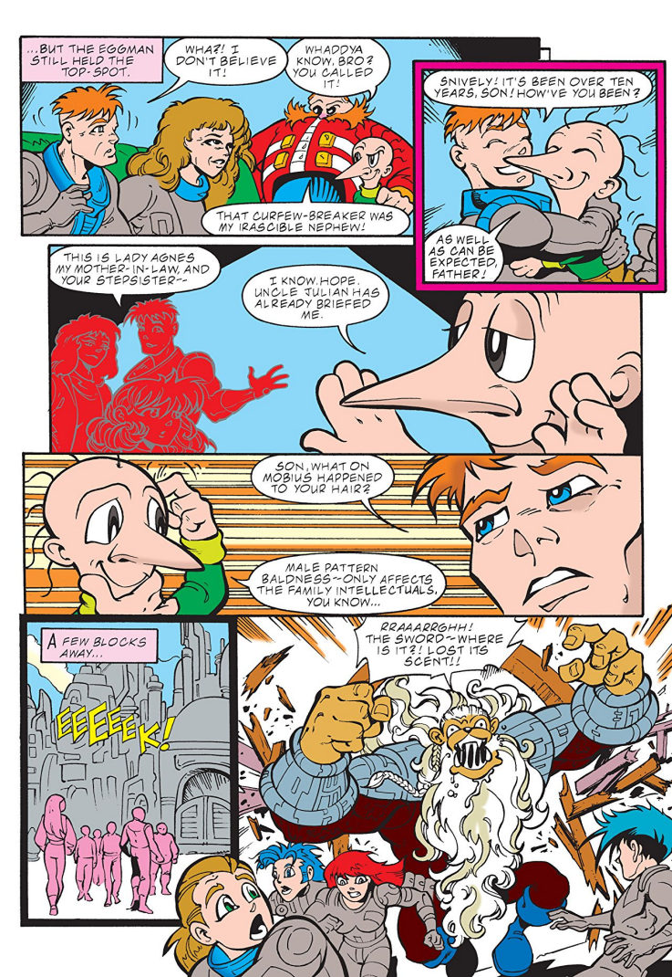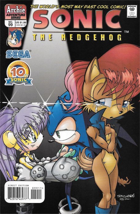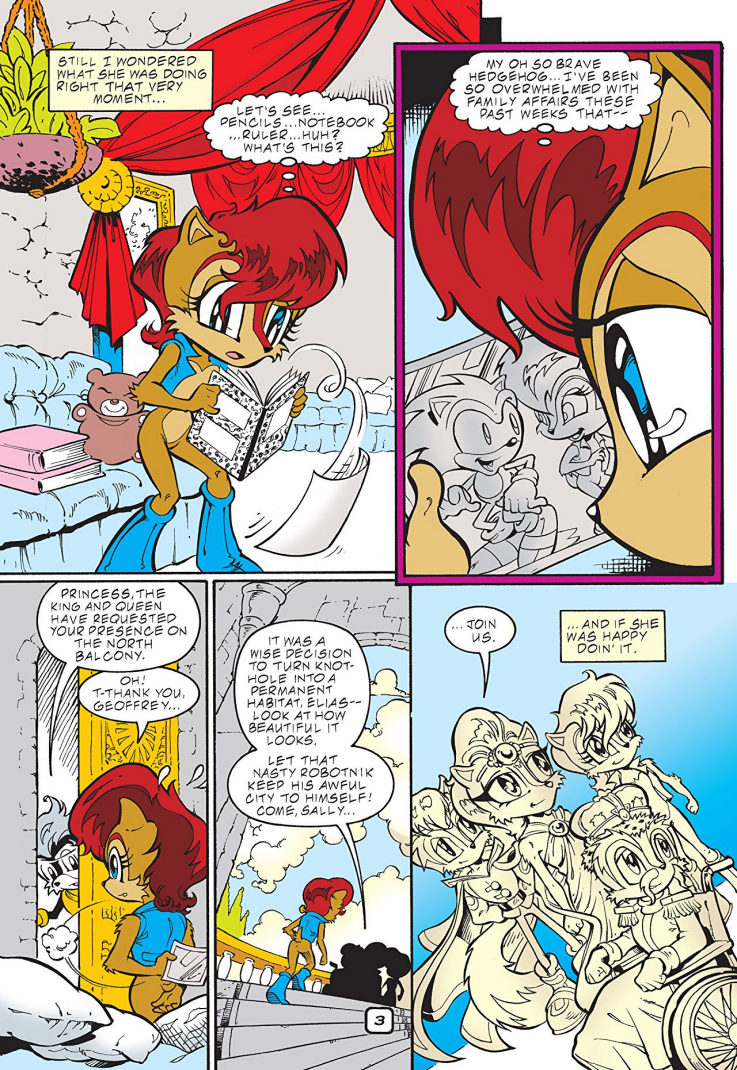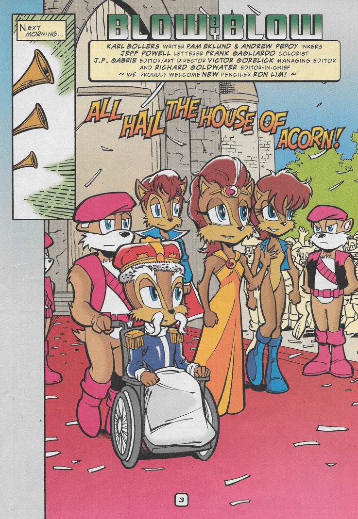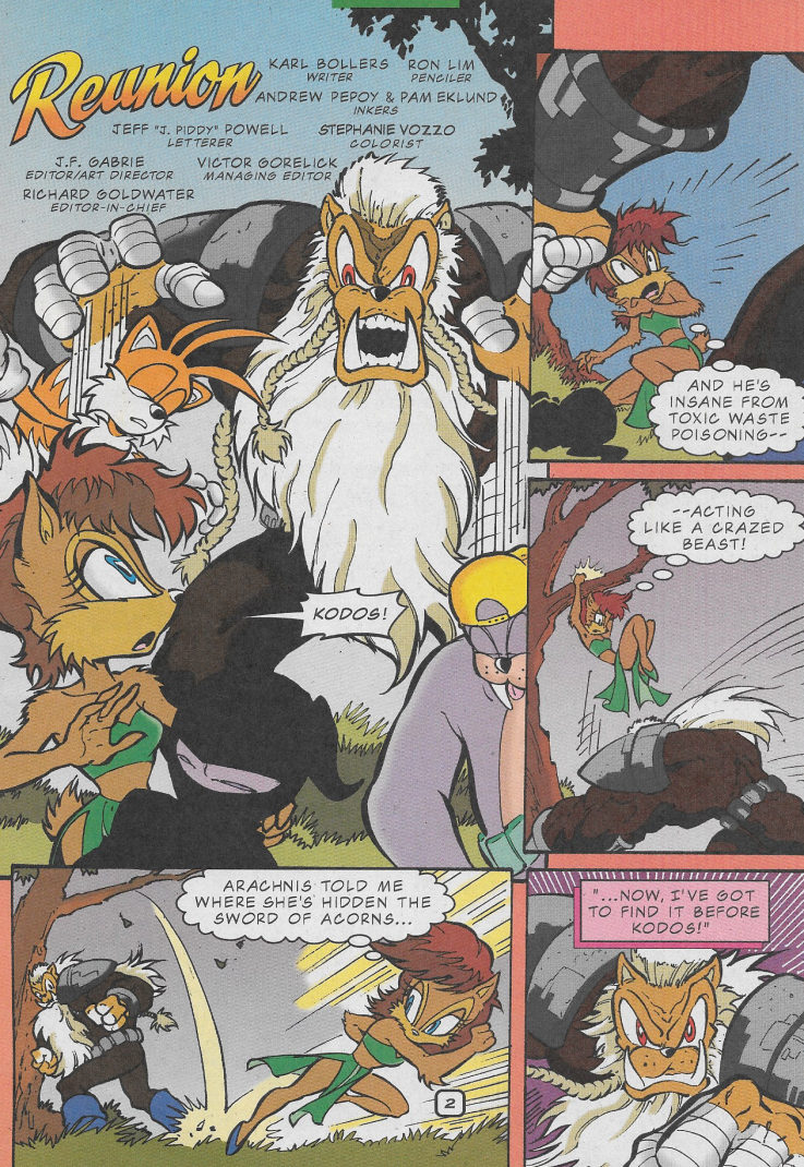 This thrill-a-minute issue is not to be missed! After returning to Knothole, Geoffrey informs Elias that Robotnik still has robotization on his mind. Sally disguises herself as a servant and manages to sneak out of Castle Acorn in order to go see Sonic, but Sonic has his hands full trying to stay incognito while he continues his quest for Arachnis and the Sword -- not to mention Mina, Sally's latest rival for Sonic's affections! The intrigue never ends in a plot where Kodos, Doctor Quack, Tails, Nate, Elias and Knuckles all play a part! And just like the previous issue -- what's with all the missing Overlanders?
