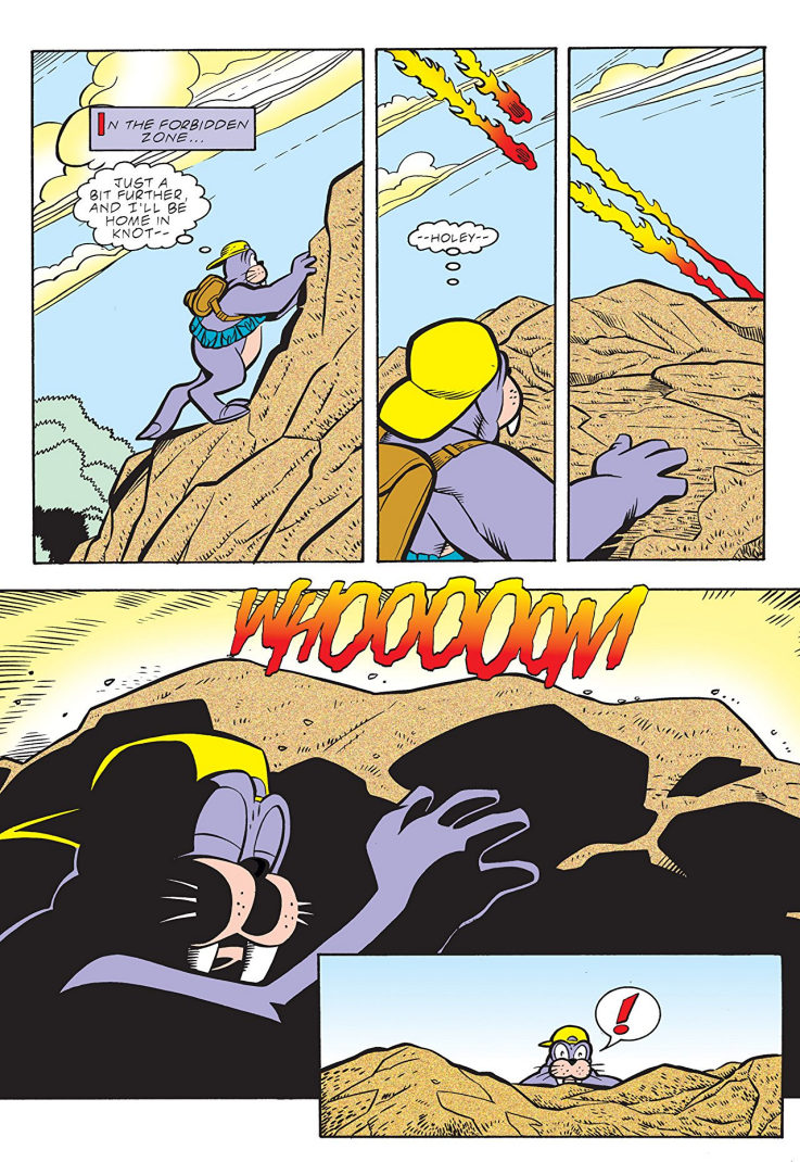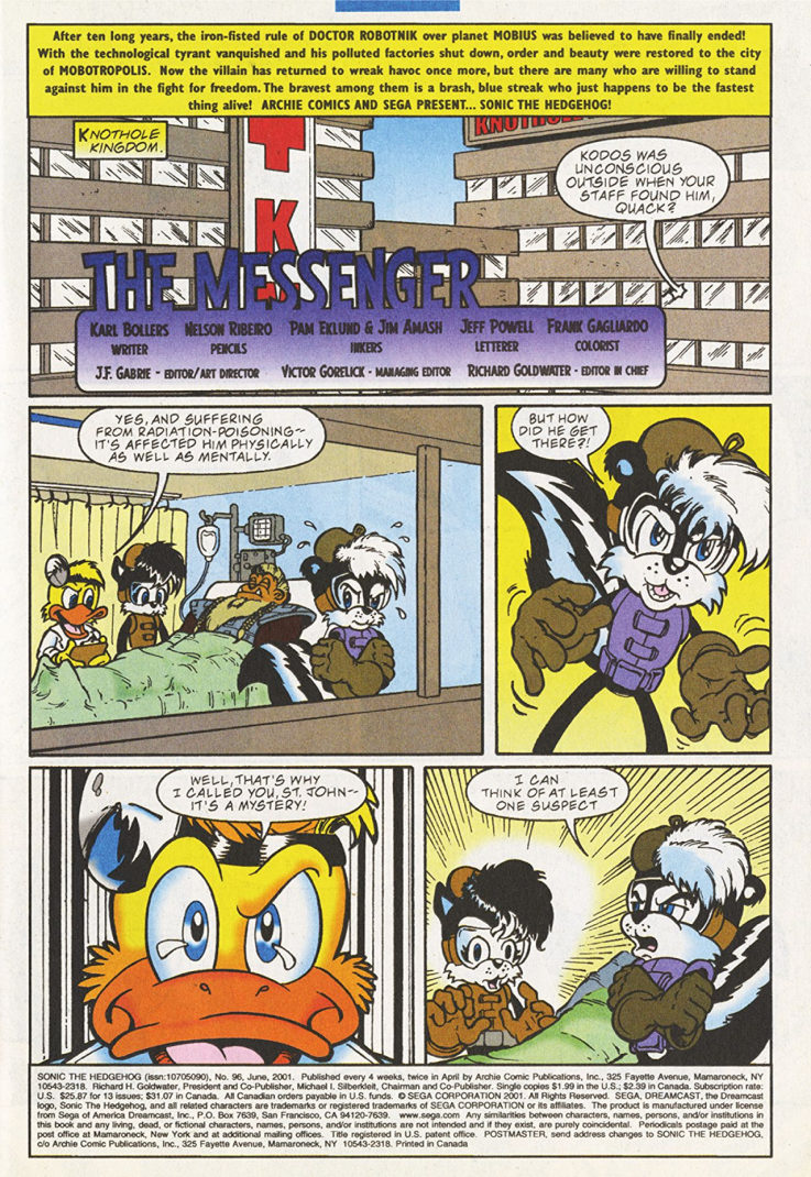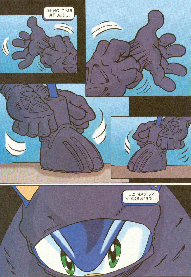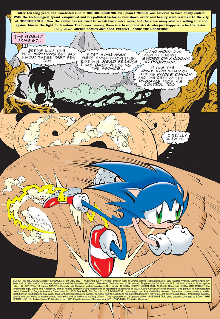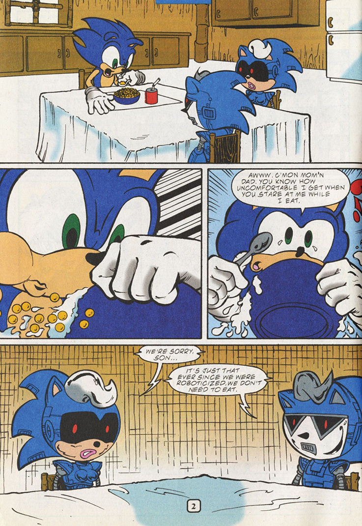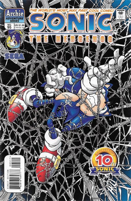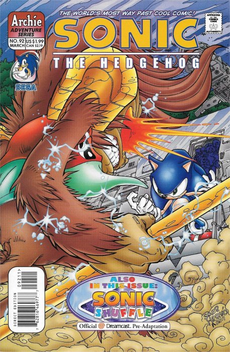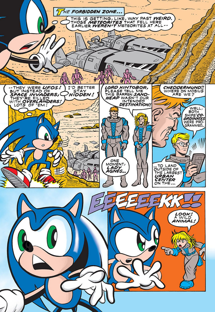 This thrill-a-minute issue is not to be missed! After returning to Knothole, Geoffrey informs Elias that Robotnik still has robotization on his mind. Sally disguises herself as a servant and manages to sneak out of Castle Acorn in order to go see Sonic, but Sonic has his hands full trying to stay incognito while he continues his quest for Arachnis and the Sword -- not to mention Mina, Sally's latest rival for Sonic's affections! The intrigue never ends in a plot where Kodos, Doctor Quack, Tails, Nate, Elias and Knuckles all play a part! And just like the previous issue -- what's with all the missing Overlanders?