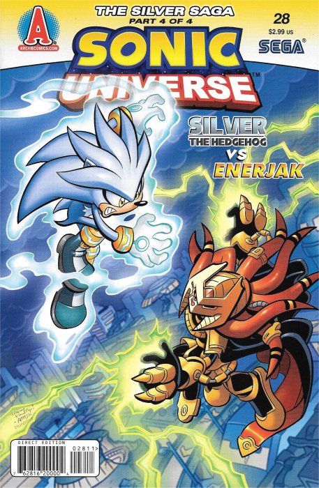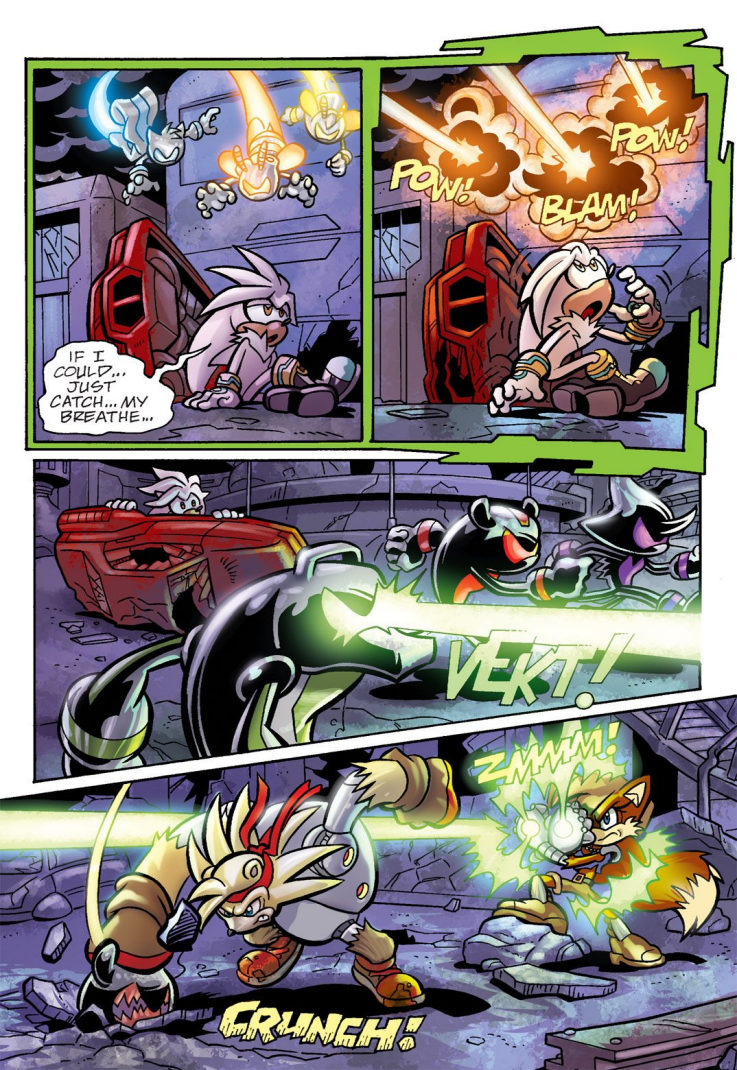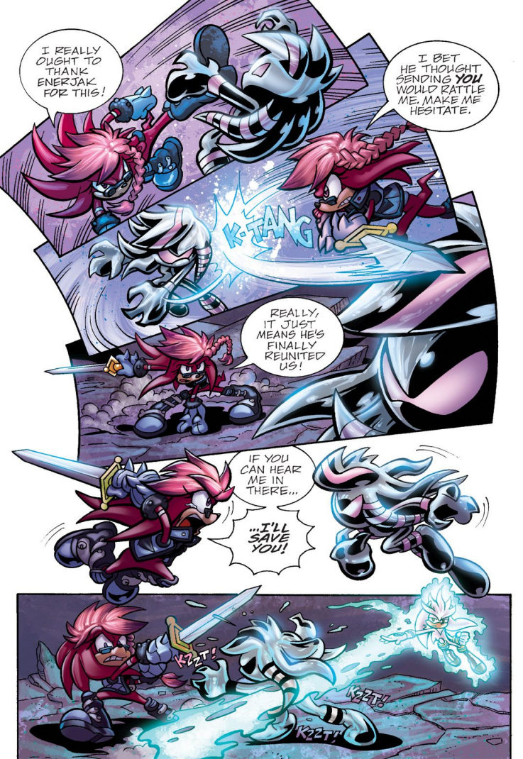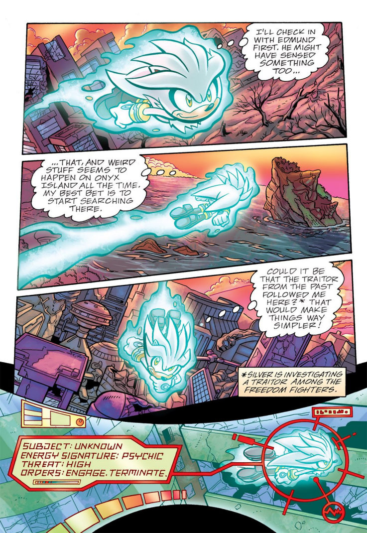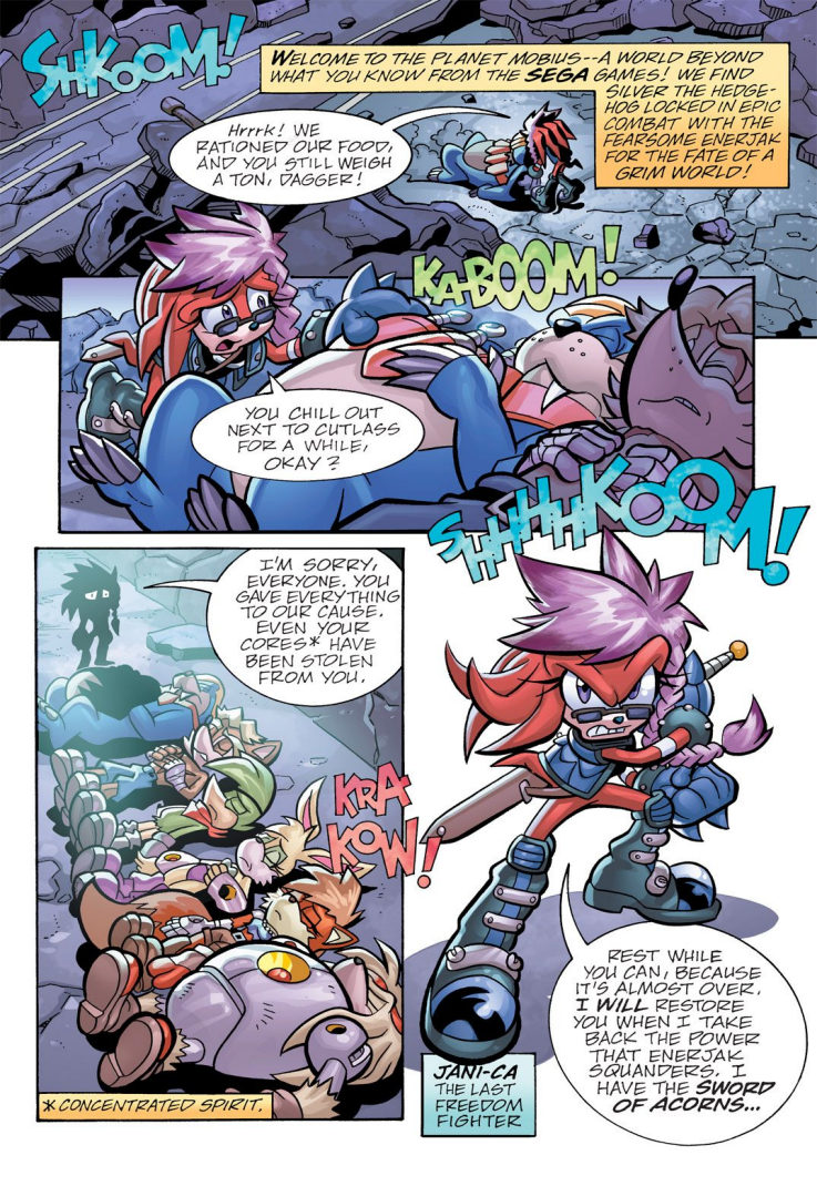 "Fractured Mirror, Part 4 of 4: Picking Up the Pieces" The Freedom Fighters have fallen! Now the only one left to save this dark world is Silver the Hedgehog! It's psychic power versus chaos power as our hero from the future goes all-out against the terrifying Enerjak! Don't miss the cataclysmic conclusion to the Silver Saga! |