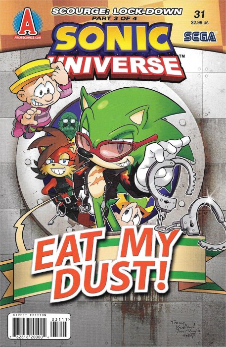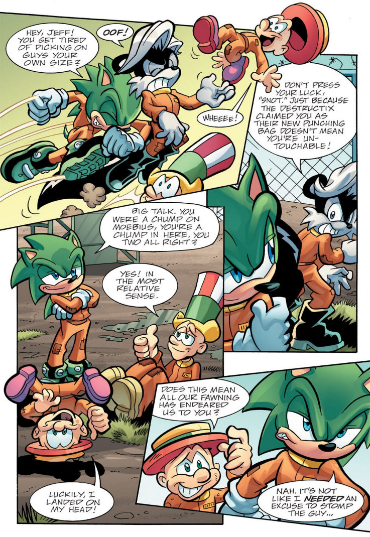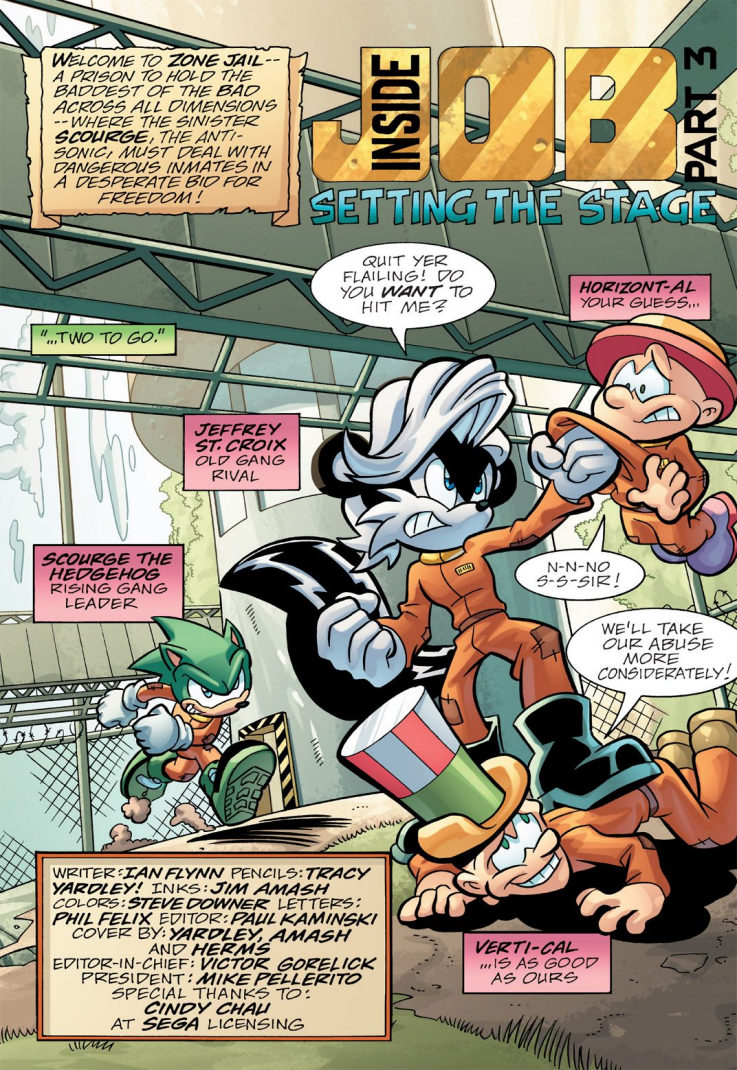 "Inside Job, Part 4 of 4: No Holds Barred" The explosive finale to the Scourge Arc! Sonic's evil twin is running with the Destructix, and they're fighting for their lives to escape Zone Jail! If the rioting prisoners don't get them, the Zone Cops will! In the mad dash for freedom, who will escape - and who will be left behind? |
