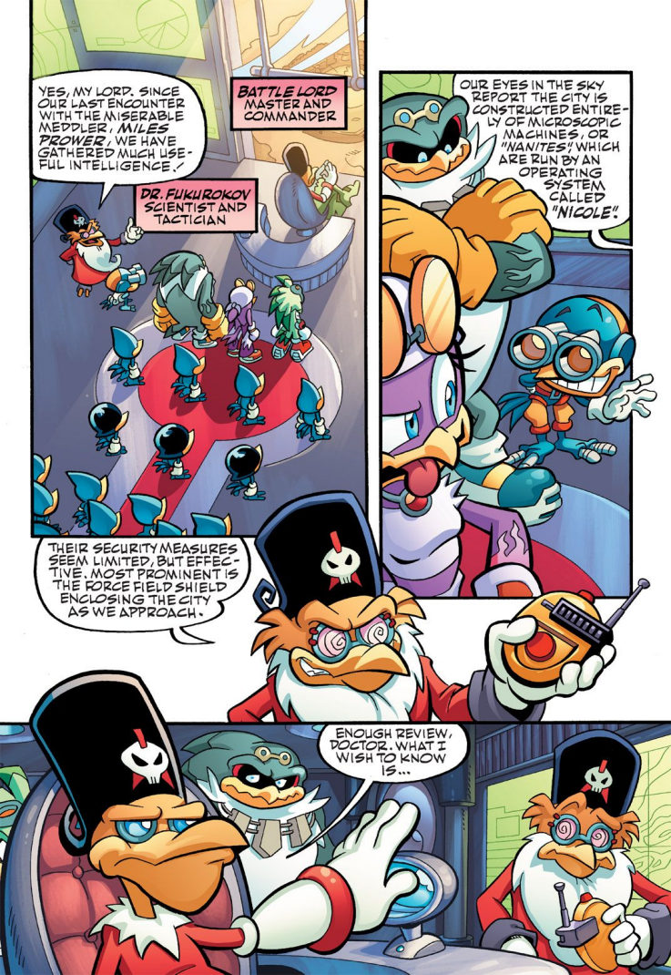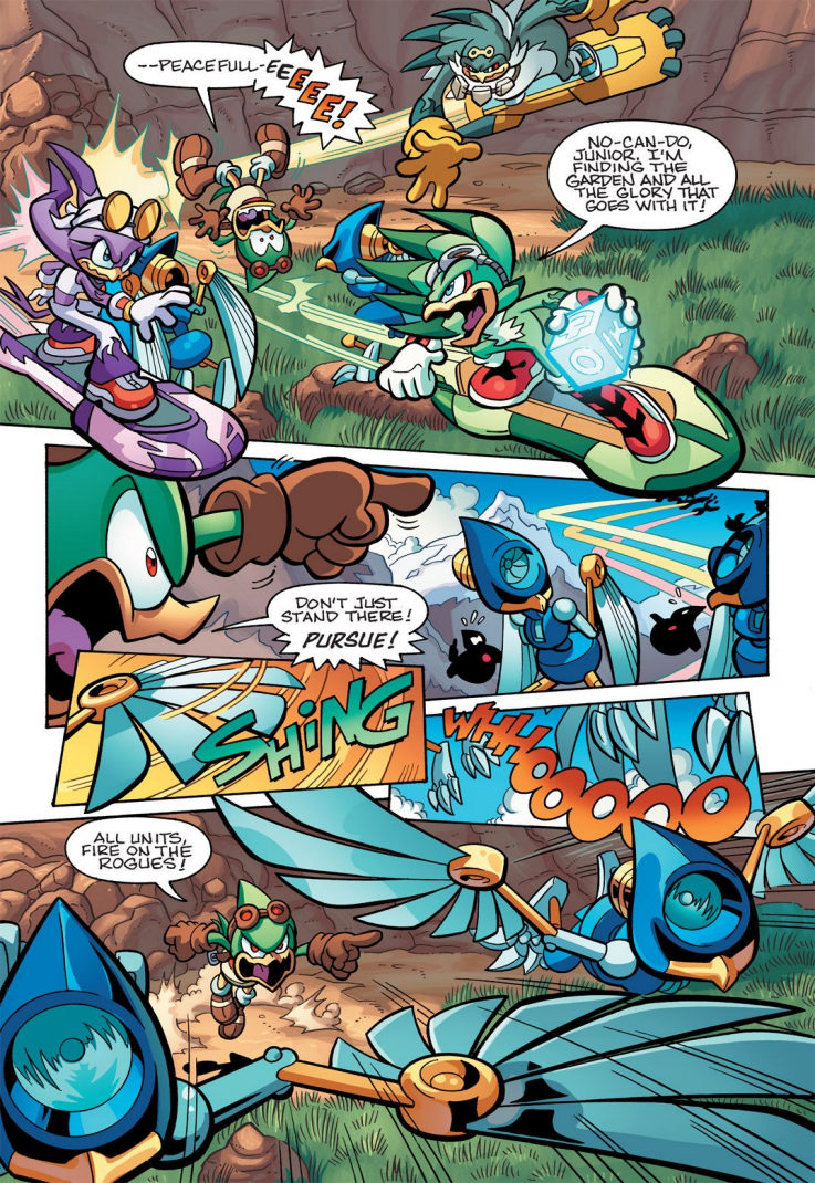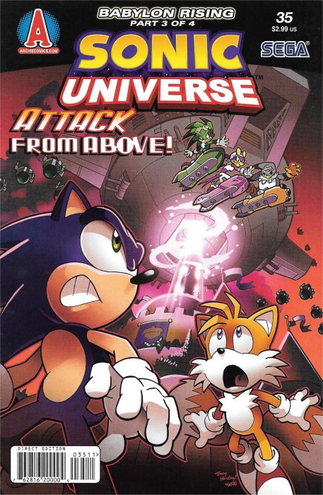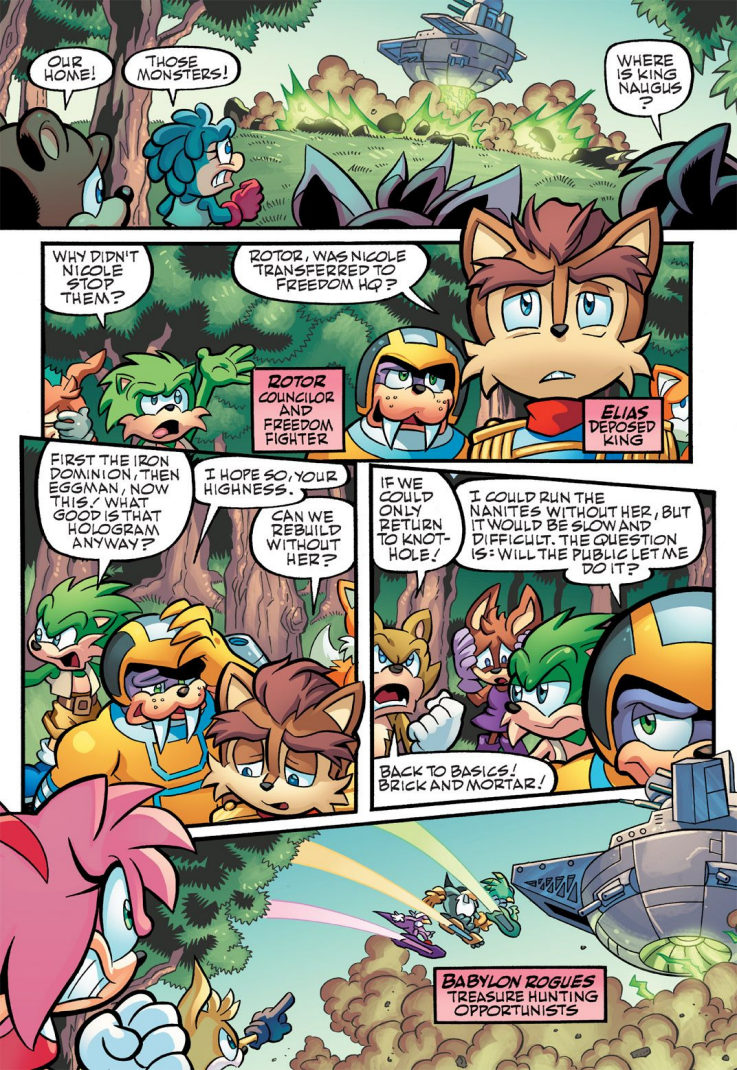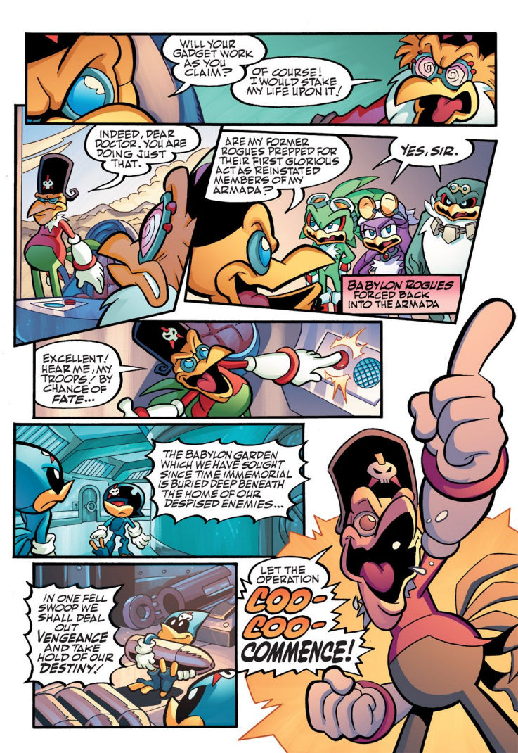 "Babylon Rising, Part 4 of 4: Resurrection" Babylon Garden has been found! New Mobotropolis is under siege! The Battle Bird Armada attacks from the sky, and Sonic the Hedgehog enters into a desperate race against the Babylon Rogues! As chaos reigns, an ancient secret will be revealed that could destroy not only the cities, but the entire world! |
