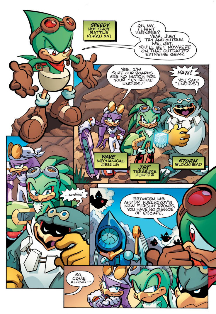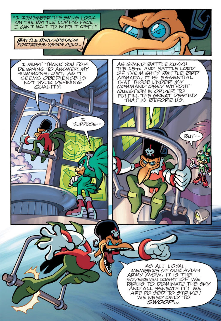 "Babylon Rising, Part 3 of 4: Retribution" The Babylon Rogues and the Battle Bird Armada – united?! And why is this fowl allegiance moving in to attack New Mobotropolis when they’re really searching for the fabled Babylon Garden? The skies erupt in battle as Sonic and Jet finally have their rematch! The surprises keep coming right through to the shocking final assault! |