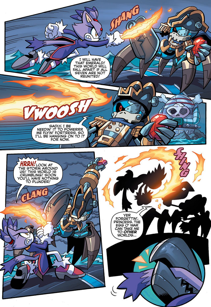 Ahoy, ye mateys! Tharr be trouble on the high seas! Blaze—a pirate prisoner! Amy, Cream and Marine—lost! Bean—an oddball, be we knew that already! It’s a race against time as Cpt. Metal begins his plan for the Sol Emeralds and his new, completed Egg o’ War! And now that ye mention it — there's something REALLY familiar about that battle station, but I just can't put me hook on it! There’s mystery and mutiny a'foot in Pirate Plunder Panic Part Two!