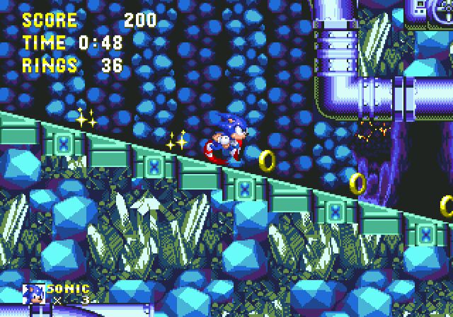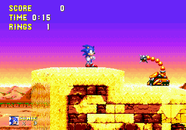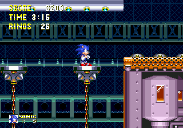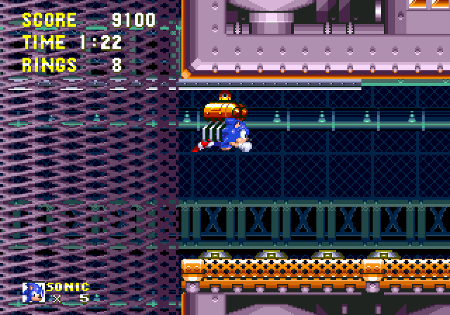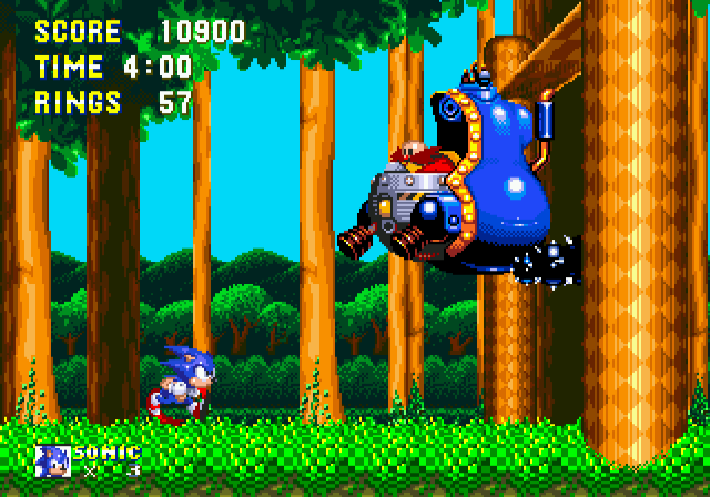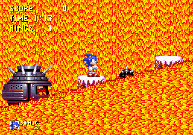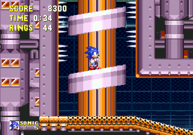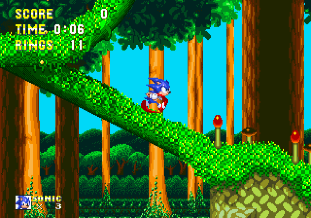 ![]() This first zone takes place in a mushroom forest. There are many secrets hidden in the walls, and many different routes to explore. You can bounce on mushrooms to reach higher places. This zone contains several badniks: Butterdroid, Dragonfly, Madmole, Mushmeanie, and Cluckoid. The act 1 boss "Hei Hou" is not particularly difficult. He chops down trees and throws the lumber at you. The act 2 boss is unique in that the screen scrolls as you chase Dr. Robotnik rather than the screen being in a fixed position like in most other boss fights. |