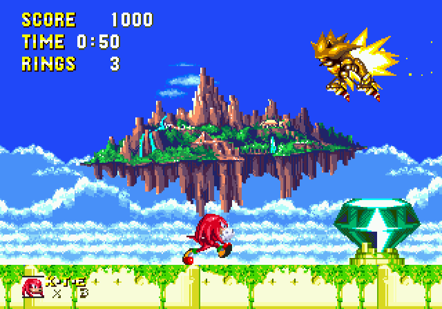 ![]() This zone houses the Master Emerald (as well as any Chaos Emeralds you have collected up until this point). Sonic faces off against Knuckles, which Dr. Robotnik sees as an opportunity to steal the Master Emerald to power his Death Egg. Only now does Knuckles realize he has been tricked the entire time into thinking Sonic was the enemy. |