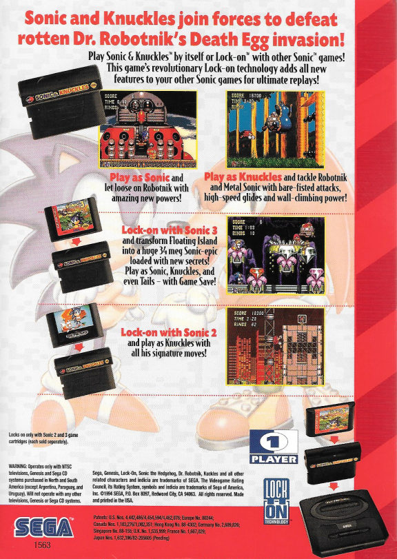 Start the game. Near the beginning of Angel Island Zone there are some swinging vines. Grab onto one of them and press Left, Left, Left, Right, Right, Right, Up, Up, Up. If done correctly you will hear the ring sound. Now pause the game and press A. This will reset the game. "Sound Test" should now be an available option on the title screen (press Up with the '1 Player' option highlighted). Select it to access the level select screen. Also, after you do this code and select a level, pause the game and you can use the B button to advance a few frames, and the C button to advance one frame. |